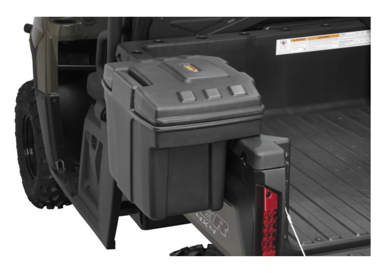 The Quad Boss Bed Box allows you to organize and secure supplies inside or even outside the perimeter of your UTV’s bed. Quick-mount pegs allow for easy installation and removal to create multiple configurations. When mounted on the outside of your UTV’s bed sides, the unit adds to overall capacity. The box is constructed from rotomolded polyethylene in a textured black finish. The heavy-duty lid is double-walled for extra durability and features a lockable latch. No tools or extra mounting hardware is needed, and the bed box is made in the USA.