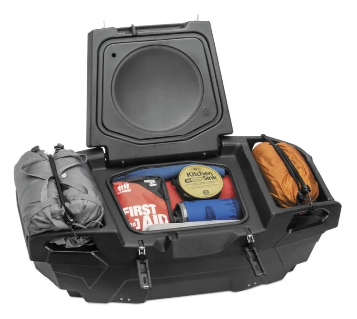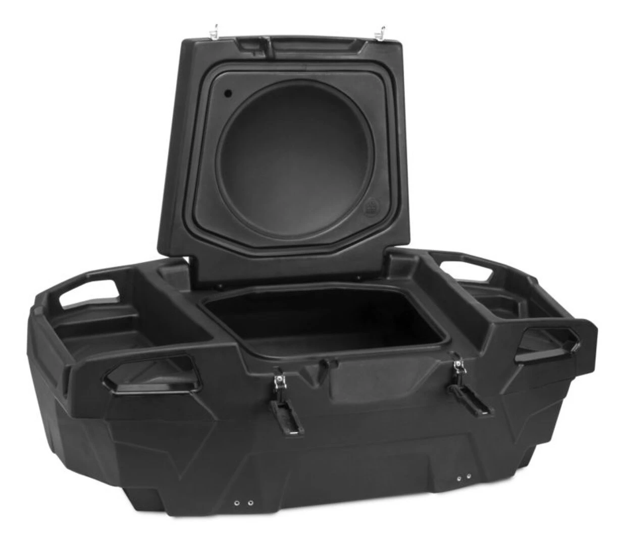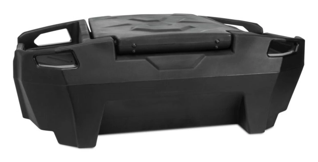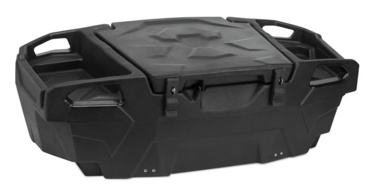 The Expedition Series Junior Cargo Box fits the rear cargo area of most UTVs and can attach to cargo racks on full-size ATVs. The Expedition Series Box sports a convenient lid that opens a full 110° for easy access to gear. The rugged rotomolded construction is sealed from the weather with a gasket at the lid. Further gear can be tethered to the exterior carry handles, and rubber latches keep the box’s cargo secure – which are compatible with padlocks.Â
