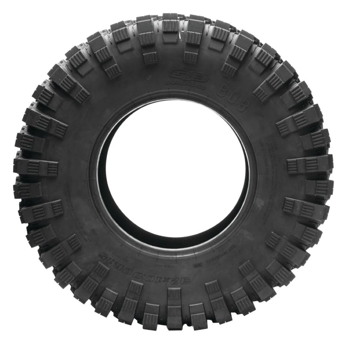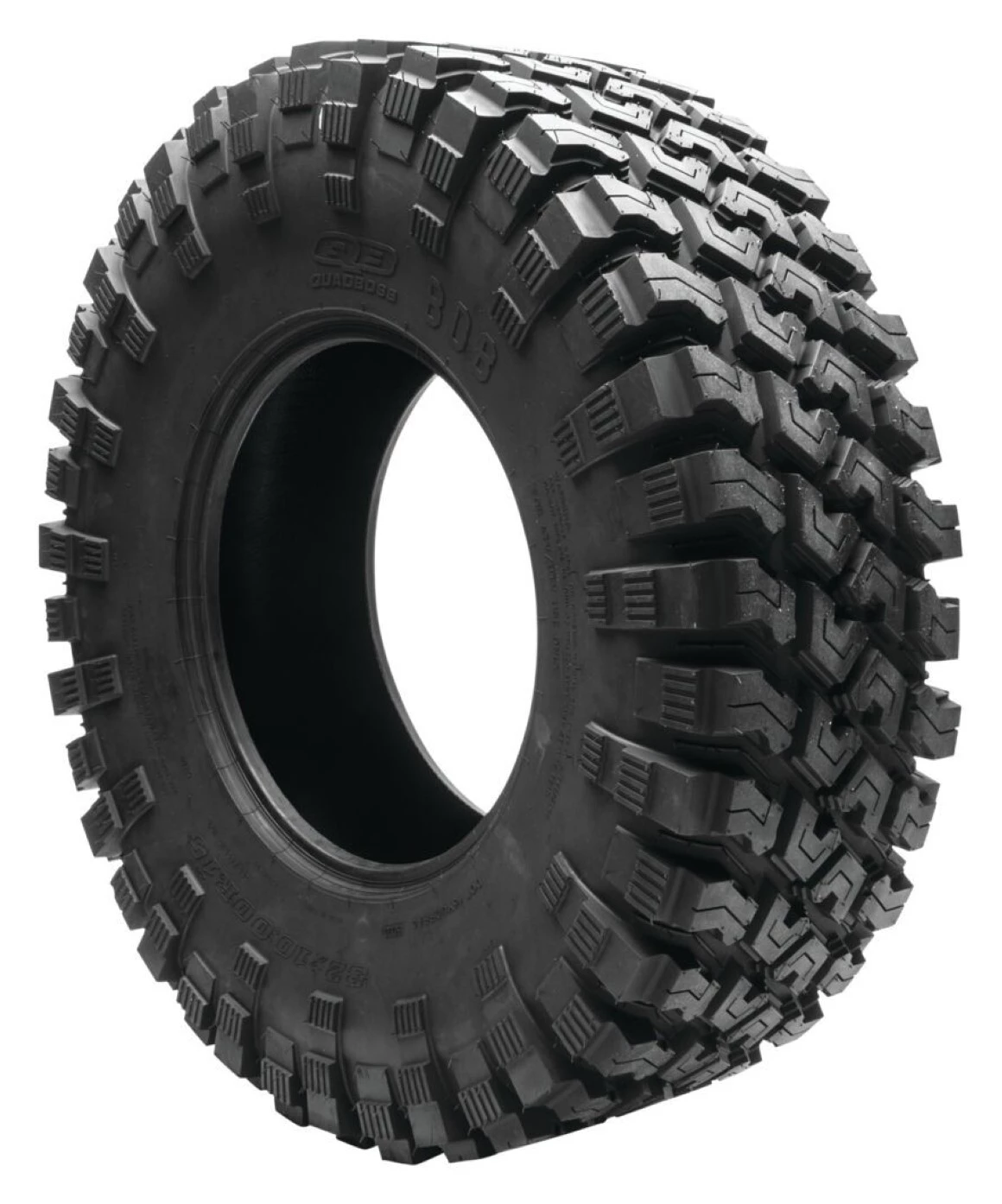 The 808 Radial Utility Tires from Quad Boss use a chain-linked chevron-shaped lug pattern to boost grip while offering good behavior over hard pack. Rolling resistance is reduced. These same treads feature improve tread life and keep road noise low. Staggered shoulder knobs increase cornering bite and stability. The 808 Utility Tire’s multi-purpose design excels over a wide variety of terrains.