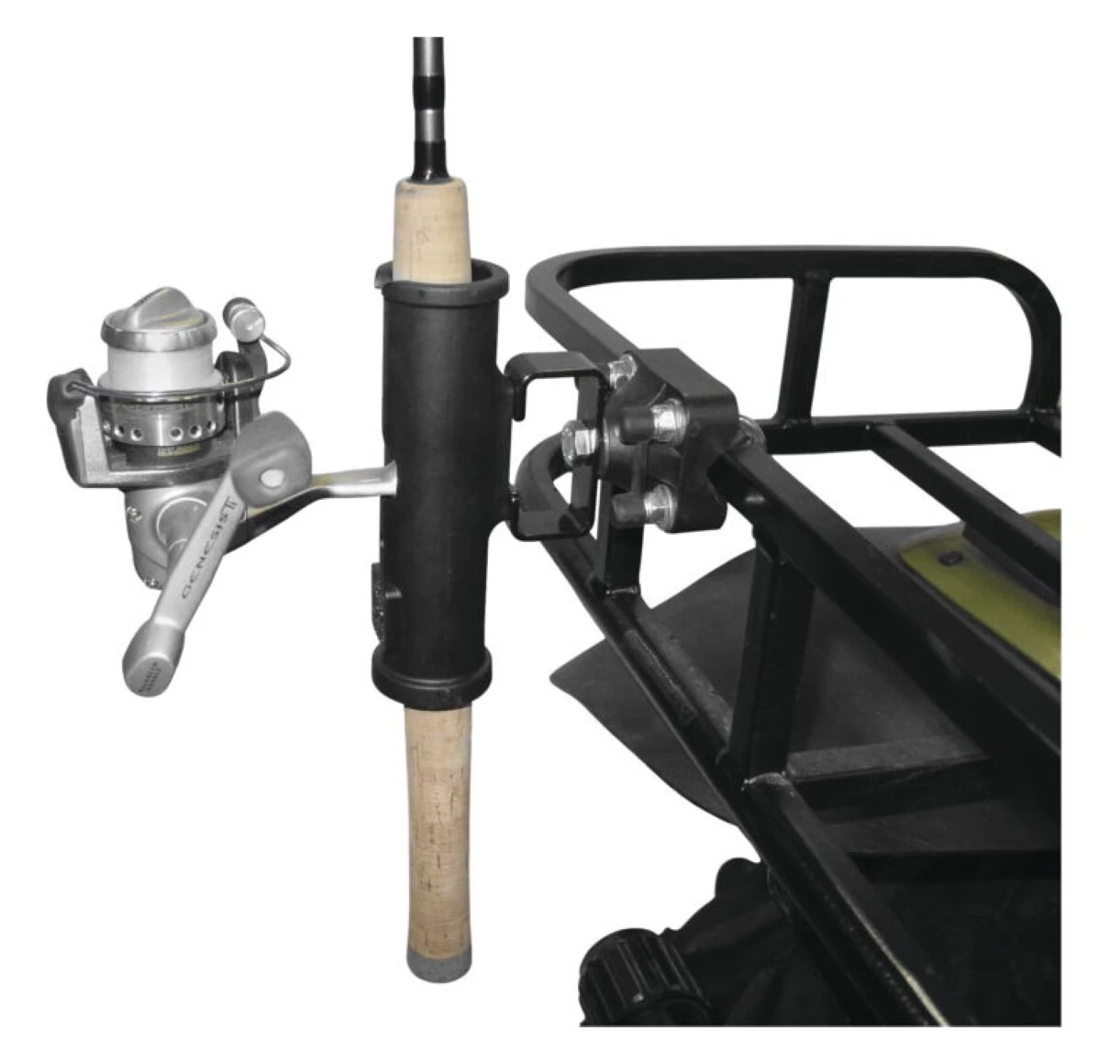 - Single Rod Holder carries one fishing pole with a spinning reel, vertically across the back or side of any ATV, UTV or motorcycle